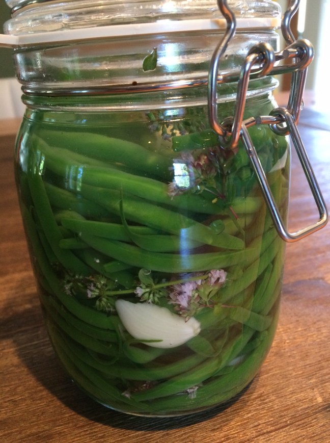 Il te faut des haricots verts ou jaunes, fraichement cueillis, de l’ail, des herbes aromatiques, de la saumure à 3 % ( = 30 grammes de sel de mer non raffiné pour 1 litre d’eau non chlorée).
