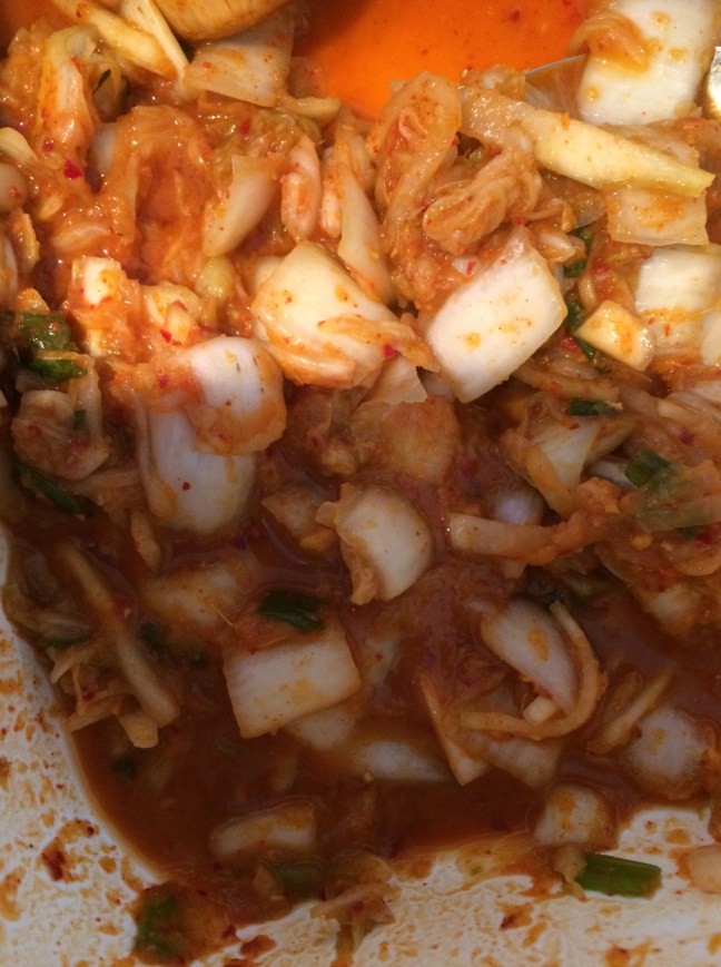 baechu saumuré (100%) + 13% de radis émincé + 3,5% de piment rouge (gochu) + 1,4% d’ail + 0,6% de gingembre + 2,2% de sauce d’anchois fermentée + 1% de sucre + 2% d’oignons verts avec 2,5% de sel au final.